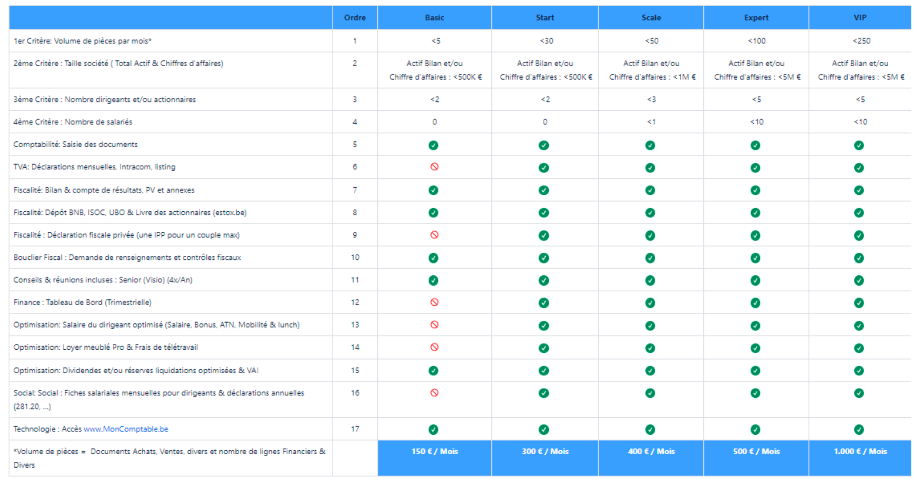 Les Packs Mensuels (€HTVA/Mois) : Les prix sont basés sur le volume de documents et financiers, la taille du bilan et du chiffre d’affaires, le nombre de dirigeants & actionnaires et le nombre de salariés. Ces 4 paramètres influencent le prix pour gérer la masse de travail et le risque lié à chaque dossier.