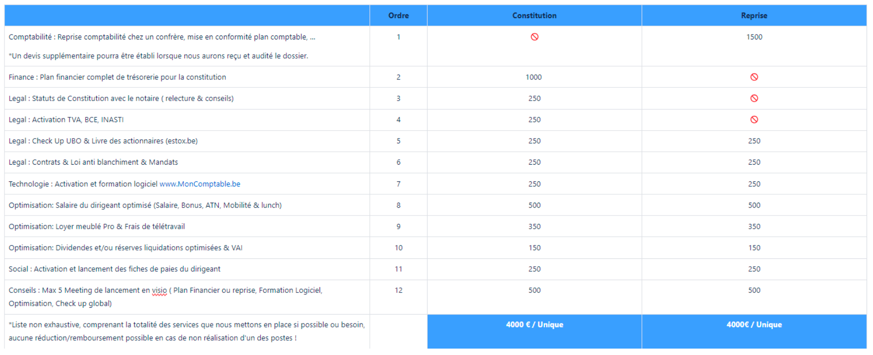 Le “Kit de Lancement” (€HTVA/Unique) : Un prix tout compris* pour la reprise ou le lancement complet de votre société. Liste non exhaustive, comprenant la totalité des services que nous mettons en place si possible ou besoin, aucune réduction/remboursement possible en cas de non-réalisation d'un des postes !